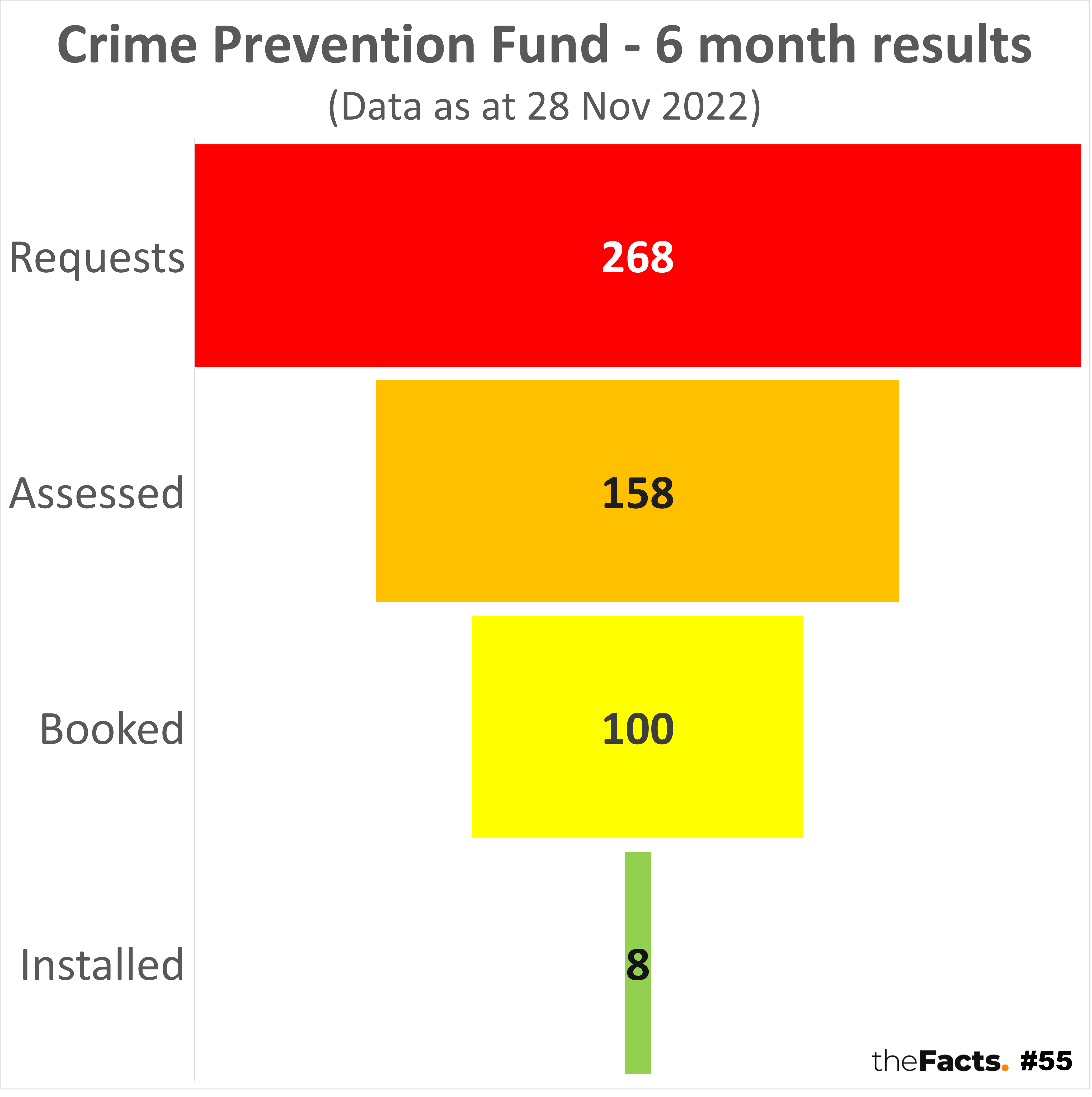 • 8 businesses have received security installations from the Crime Prevention Fund since being launched 6 months ago. A small percentage of all small retailers.