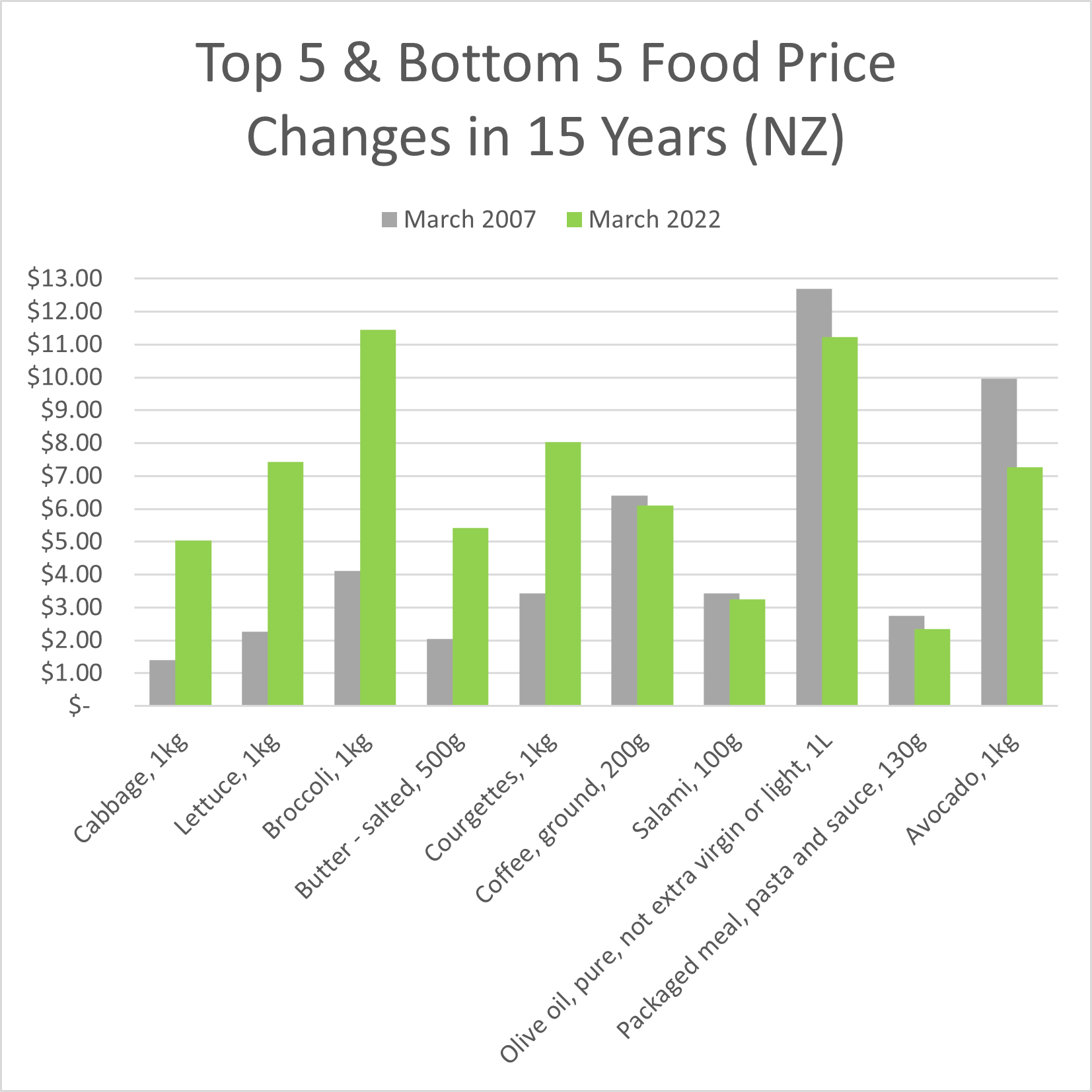 | Food item | March 2007 price | March 2022 price | % change |
