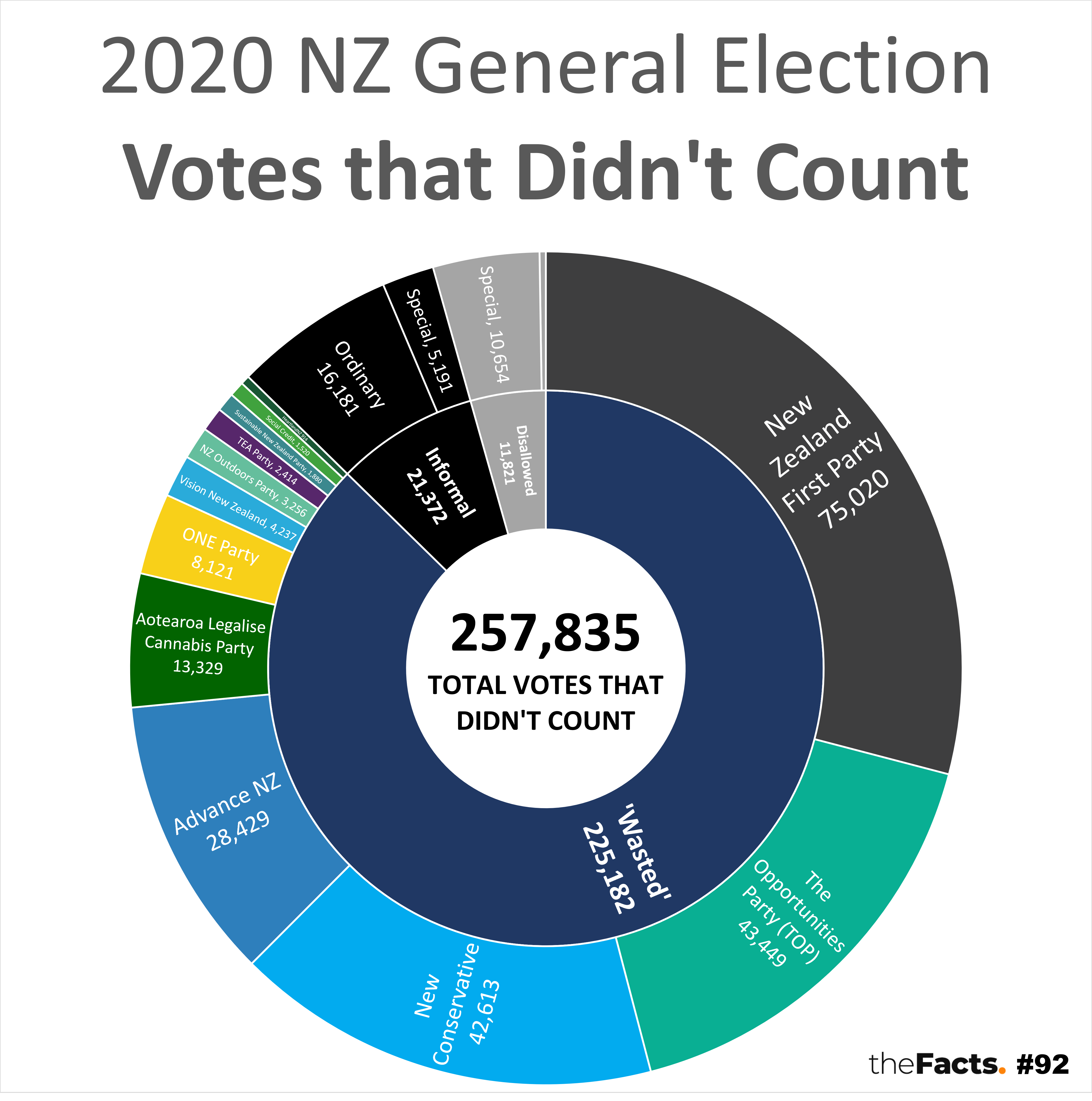 - 225,182 (8%) went to parties that did not make it into Parliament because they did not win an electorate seat or reach the 5% party vote threshold (144,321 votes in 2020). These are often referred to as ‘wasted’ votes.